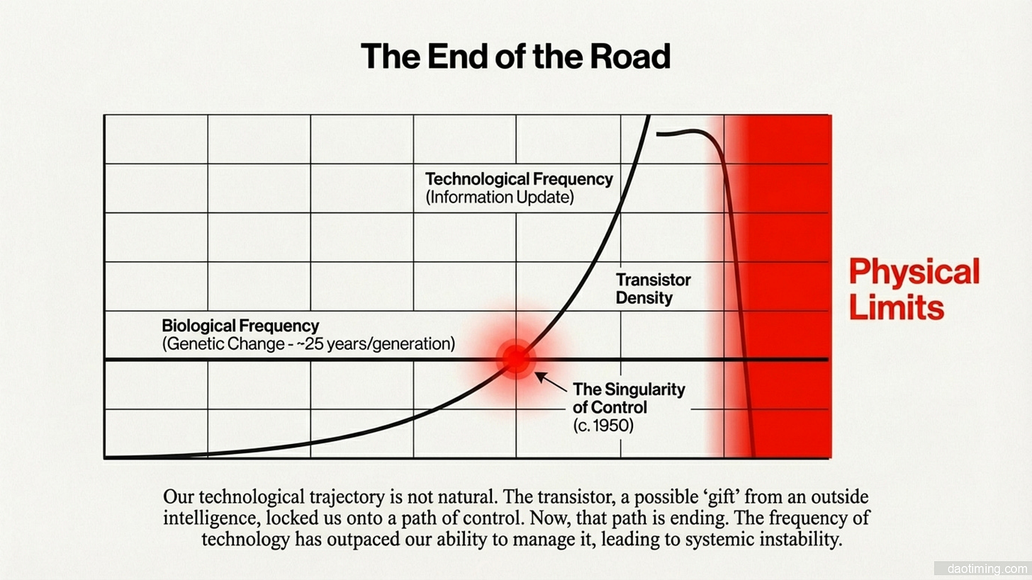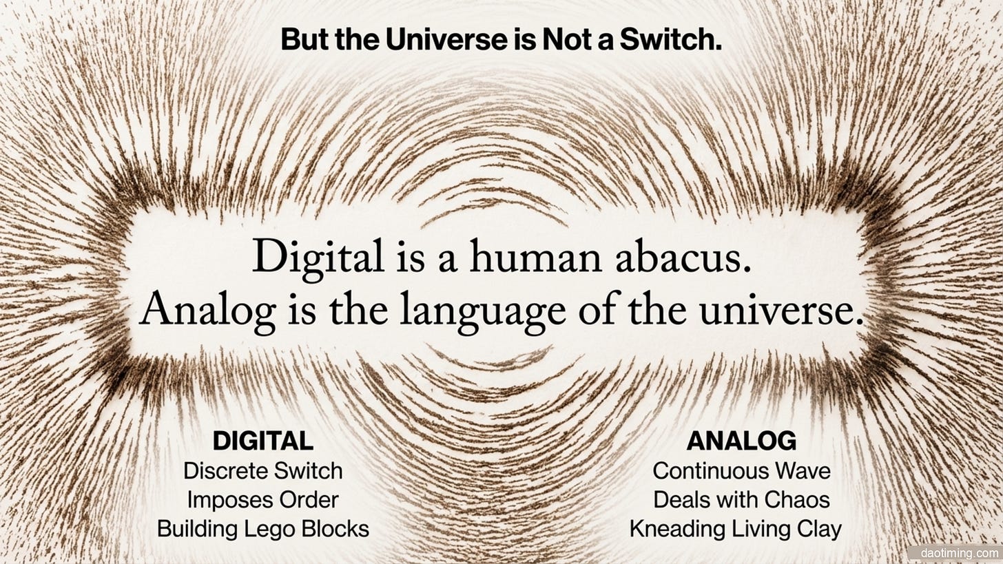 晶体管文明是一种基于暴力切割和二元对立的初级智能文明。它的底层逻辑是开关。核心教义只有两个字:阻断与放行。它不承认中间状态,不承认模糊地带,一切必须坍缩为 0 或 1。在模路的世界里,1点1不等于1。但是在数字电路的世界里,一切数据都从中心往两边塌缩。这种物理结构直接映射到了人类的意识形态上。在晶体管文明里,世界被强制划分为:对与错、敌与友、贫与富、控制与被控制。 它是分裂的,是冲突的,是因为恐惧不确定性而建立的逻辑监狱。思维形态是二元对立。为了计算,晶体管文明把原本连续、平滑、充满灵性的真实宇宙(模拟波),强行切碎成了锯齿状的数字台阶。它丢弃了所有的细节和噪音,而那些被丢弃的,恰恰是生命的真相(神性)。这是对于现实的篡改,被叫做量化处理。它是通往高维文明的脚手架,也是目前困住我们的栅栏。它让我们学会了计算,却让我们忘记了感知。我们必须意识到,我们正处于一个旧时代的黄昏。这个统治了我们70年的晶体管文明,用它那冷酷的 0 和 1,构建了一个看似坚不可摧的控制论大厦。但它忘记了,宇宙的本质不是开关,而是波动…