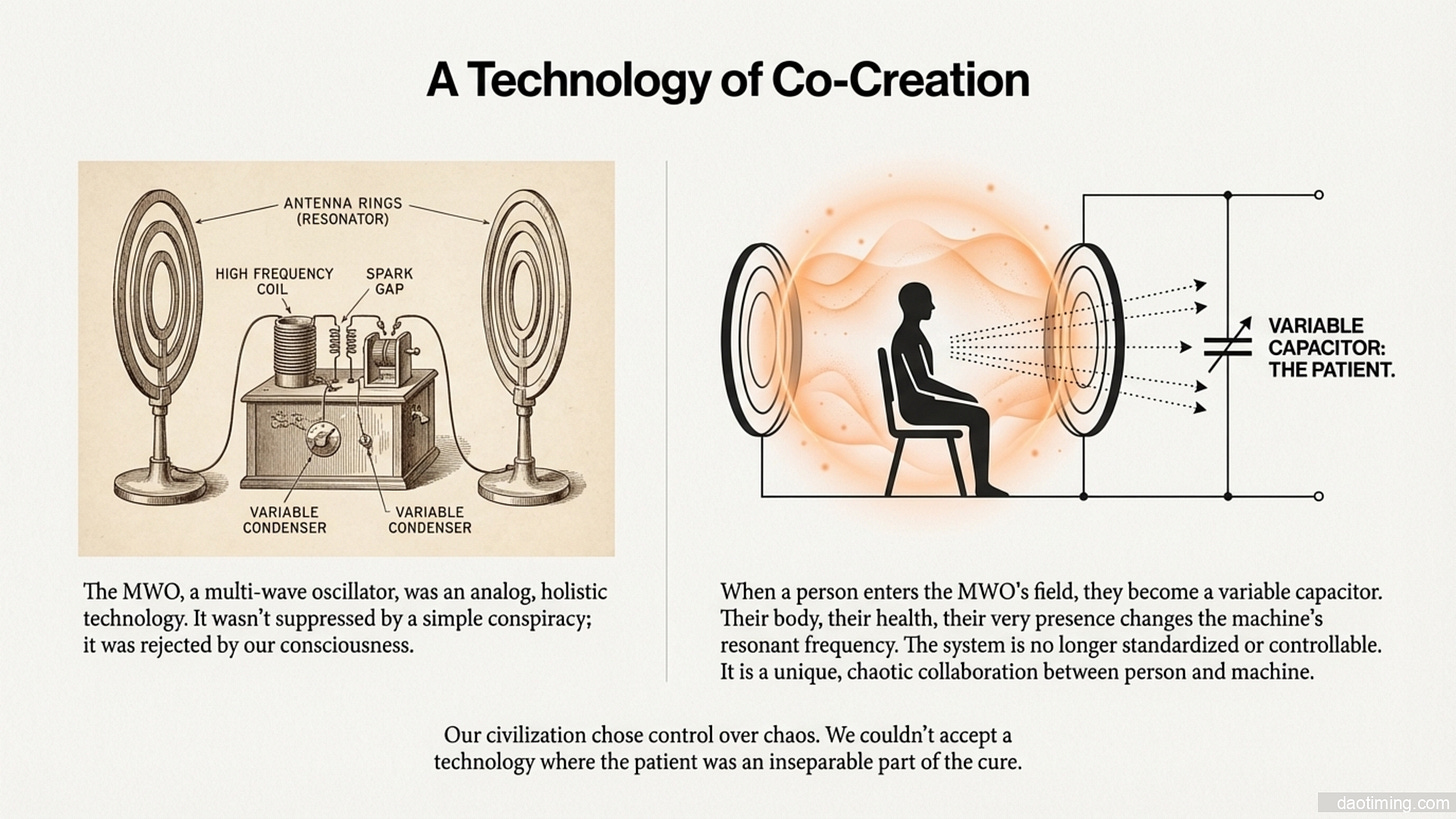 这也是我在研究 M-W-O,——也就是拉霍夫斯基的多波振荡器时,发现的一个惊人的底层逻辑。什么是M-W-O呢?就是据说这玩意儿可以校整人类的频率,然后医治很多的疾病。所谓的 M-W-O,它本质上是一个靠空气耦合的高压电源系统,配合一组精密的谐振天线,在空间中制造出一个广谱的能量场。很多人也买过这些贴片,但是用处不是很大。因为它的这个线圈按照它的直径是跟不同的波进行,就是激发的。所以你如果没有高压作为一个高频的发声和能量的提供的话,它这个并没有很大的作用。